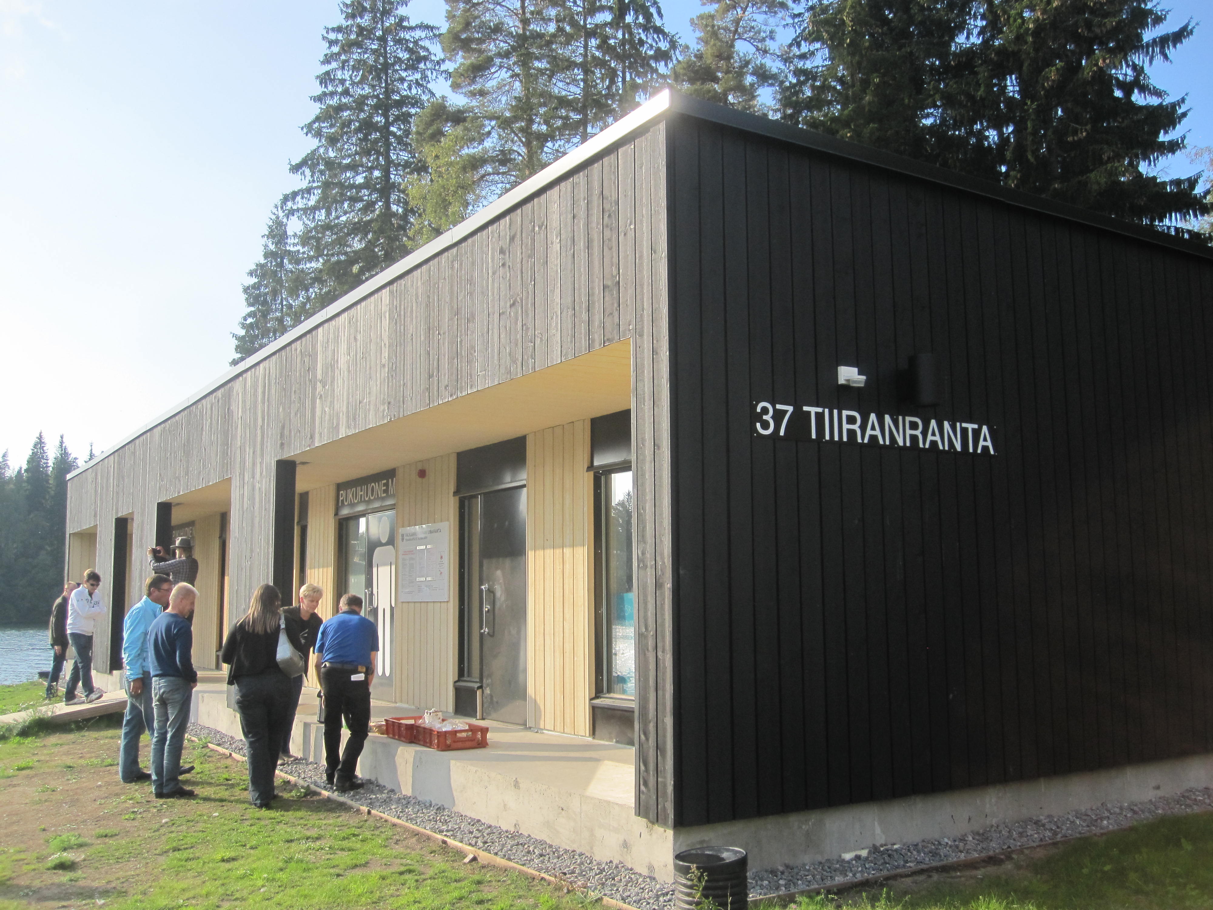 Pysähdyimme myös Tiiranrannassa tutkailemassa uutta pukutilarakennusta. Olin valtuustossa aikoinaan suhteellisen aktiivi hankkeen vastustaja, mutta siinä se yli puolen miljoonan pukukoppi nyt jökötti. Kovista kustannuksista huolimatta pytinki ei mitenkään pramealta, eikä valitettavasti edes kovin laadukkaasti rakennetulta vaikuttanut. Ikkunoiden vesipellit jäivät käteen, kun ihmettelin niiden olemattomia kallistuksia ja pellitysten vuotokohtia. Julkisivulaudoituksen kanssa otaksun tulevan ongelmia jo ennen kuin takuuaika on lopussa. Laudat olivat kohtuullisen käppyrällä jo nyt ja maalia ei ollut riittänyt juuri lainkaan lautojen sivuille. Noinkin tumma lautaverhous on avoimella paikalla erityisen kovalla rasituksella, kun aurinko paahtaa täysin suojaamattomaan seinäpintaan ja rakennuksessa ei ole lainkaan räystäitä suojaamassa sadevesiltä. Ettei vaan tapahtunut triplavirhe tämän hankkeen osalta: ensiksi päätettäessä hankkeeseen ryhtyä, sitten suunniteltaessa kallis räystäätön rakennus ja lopputulos kruunattiin huonolla viimeistelyllä.