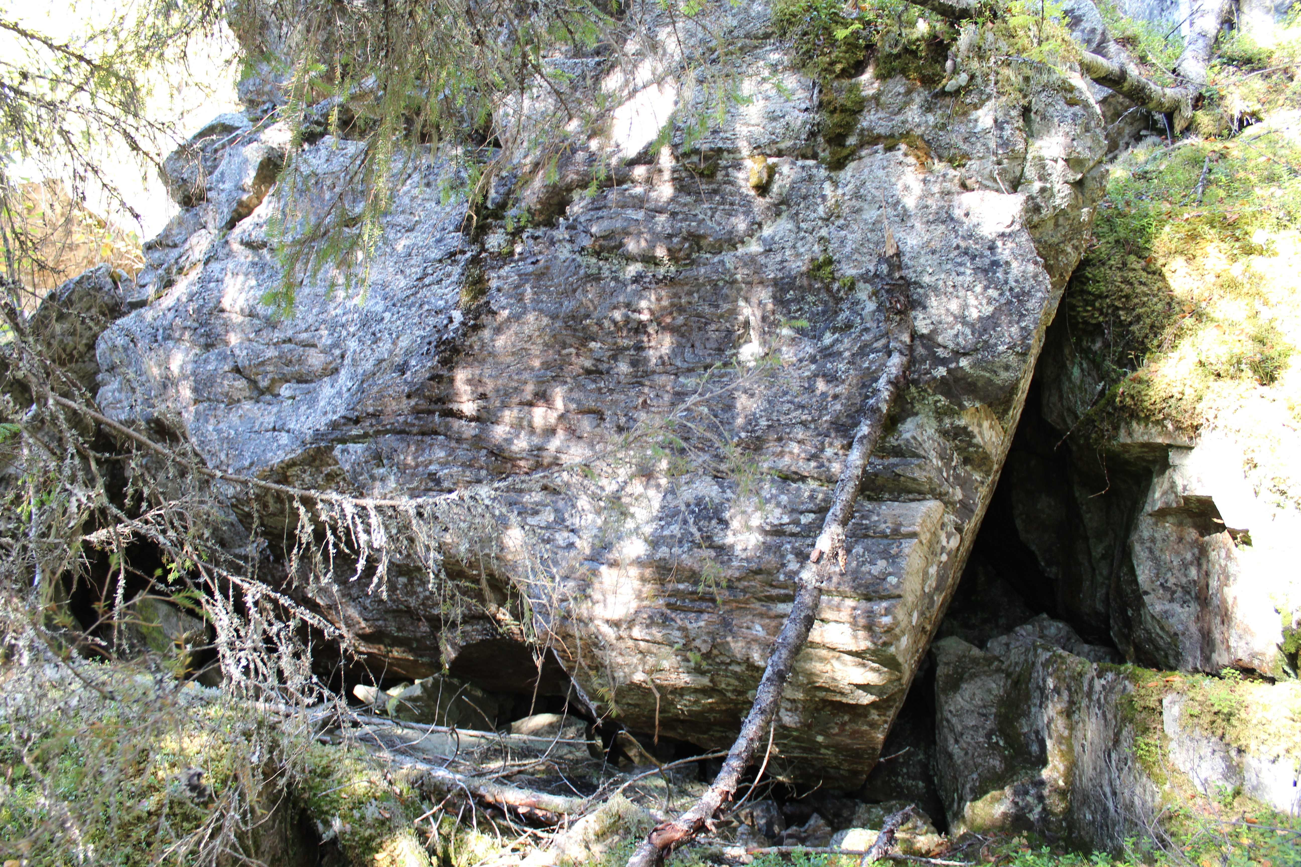 Sieltä löytyikin melkein yhtä hieno louhikkoinen jyrkänne, jossa oli kalliokielekkeitä ja monenlaista onkaloa. Pikkaisen hankalaa oli kiipeily ja kulku, kun jyrkännettä peitti puolimetrinen sammal, jonka alla oli jemmassa pirunmoisia onkaloita. Koivet on kovilla tuollaisessa maastossa.