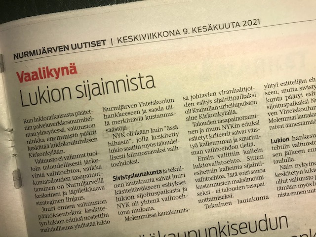 Nurmijärven Uutisten 9.6.2021 numerossa oli näiden kuntavaalien viimeinen Vaalikynä-kirjoitus osaltani.