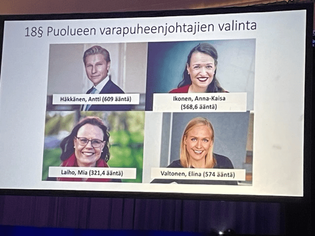 Kovin suuri yllätys ei ollut, että puolueen koko puheenjohtajisto: pj. Orpo sekä varapj:t Häkkänen, Valtonen ja Ikonen valittiin jatkokaudelle, vaikka varapuheenjohtajiston osalta päästiin pitämään vaalit. Sote-osaaja Mia Laiho jäi kuitenkin äänestyksessä puheenjohtajiston ulkopuolelle. Myös puoluevaltuuston puheenjohtaja Heikki Autto sai jatkokauden yksimielisesti. Sen verran upeata työtä Heikki on tehnyt puoluevaltuustossa, että haastajaa ei ilmaantunut. Nurmijärveltä puoluevaltuuston jäseneksi valittiin pitkään yhdistys- ja järjestötoiminnassa vaikuttanut Leena Zittling. Itse sain paikan puoluevaltuuston varajäsenenä ja puolueen sääntöjen mukaan tämä tulee olemaan osaltani viimeinen kausi, koska alla on jo yksi kausi varsinaisena jäsenenä ja yksi varajäsenenä.