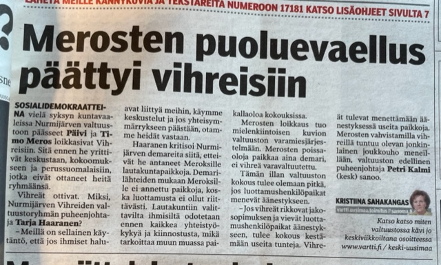 Paikallislehti Vartti uutisoi asiasta otsikolla “Merosten puoluevaellus päättyi Vihreisiin”. Artikkelin mukaan kaksikko oli käynyt koputtelemassa jo ennen Vihreitä kolmen muun valtuustoryhmän ovea. Keskustan Petri Kalmi totesi, että jonkinlaista joukkouhoa Vihreissä on havaittu.