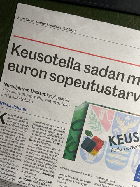 Hyvinvointialueen 69:stä aluevaltuutetusta 16 tulee Nurmijärveltä. Lehtiartikkelin perusteella näistä kymmenen aluevaltuutettua oli vastannut lehden kyselyyn. Lehti totesi, että etenkin kokoomuksen aluevaltuutetut nostivat esille valtakunnallisen hyvinvointialueiden rahoitusmallin, jota kuvataan Keski-Uudenmaan osalta epäoikeudenmukaiseksi. Luonnollisesti hallituspuolueiden aluevaltuuteut eivät kritiikkiä luomukseensa juurikaan tuoneet julki. Aluevaltuutettu Kimmo Behm (KOK) totesi, että taloudelliset resurssit ovat alimitoitettuja kaikkien hyvinvointialueiden osalta. Itse totesin, että rahoitusvaje on niin valtava, että lisärahoitusta tarvitaan tulevinakin vuosina ja lisäsin, että valtiovalta saisi säästöjä aikaan, jos hyvinvointialueiden järjettömän suurta määrää supistettaisiin.