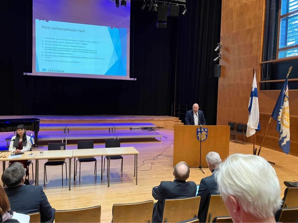 Suurin mielenkiinto – kuten syyskokouksessa yleensä – kohdistui piirin puheenjohtajan valintaan. Istuva puheenjohtaja, kansanedustaja, Heikki Vestman sai jatkopestin puheenjohtajuudelle vuodelle 2024. Olin Vantaan Mika Kasonen ohella toinen Vestmanille kannatuspuheen pitäneistä kokousedustajista.