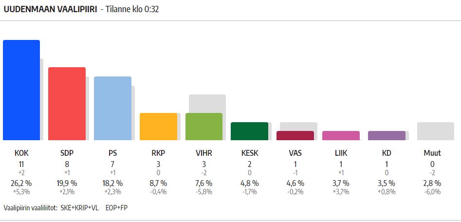 Kokoomuksen menestys Uudellamaalla oli erinomainen. Äänimäärä kasvoi melkein 34.000:lla ja se toi kaksi lisäpaikkaa eduskuntaan. Ehdokasasettelu oli varsin onnistunut ja se näkyi tuloksessa. 11 kansanedustajan joukkoon mahtuu kuusi aiempaa parlamentaarikkoa ja viisi uutta, joista neljä oli nyt ehdolla ensi kertaa. Muutaman kerran aiemminkin ehdolla ollut Tere Sammallahti meni nyt hienosti läpi. Äänikynnys nousi näissä vaaleissa todella korkealle kokoomuksessa. Läpimenoon kokoomuksen listalta tarvittiin nyt peräti 5218 ääntä. Sain edellisissä vuoden 2019 vaaleissa 1388 ääntä, joka riitti kokoomuksen listalla sijaan 21 ja jäi läpimenosta noin 2000 äänen päähän. Näissä vaaleissa se äänimäärä olisi riittänyt sijaan 31 ja matkaa läpimenoon olisi ollut yli 3800 ääntä.