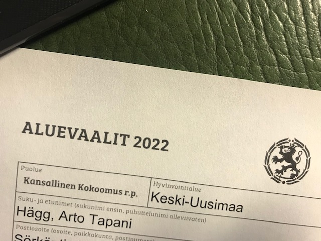 Vuosi 2022 oli jälleen vaalivuosi, kun tammikuussa pidettiin historian ensimmäiset aluevaalit. Tulin valituksi Keski-Uudenmaan aluevaltuustoon 498 äänellä. Myöhemmin sain toiveeni mukaisesti paikan myös Keski-Uudenmaan pelastuslautakunnan jäsenenä. Kokoomuksesta tuli hyvinvointialueen suurin valtuustoryhmä 18 jäsenellä.
