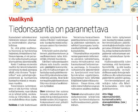 Marraskuussa käytiin myös OP Uusimaan edustajiston vaalit. Totesin jo ennen vaaleja, että vaikka edustajiston toiminta on pitkälti sääntömääräisten asioiden päättämistä, niin esim. fuusiopäätöksissä pääsi edellisellä kaudella käyttämään tosiasiallisesti päätösvaltaa ja vaikuttamaan pankin ja sen omistaja-asiakkaiden tulevaisuuteen. Edustajiston jäsenenä saa myös erinomaista informaatiota ja koulutusta pankki- ja rahoitusalasta, pankin toiminta-alueesta ja sen elinkeinoelämästä. Koen, että tuosta informaatiosta on hyötyä myös toiminnassani kunnanvaltuutettuna ja aluevaltuutettuna. Erinomainen asia on myös se, että pankin edustajistossa tutustuu alueen muihin päättäjiin ja luottamushenkilöihin. Olin siis ehdolla ja tulin valituksi toiselle kaudelle edustajistoon.