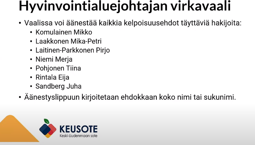 Syyskuussa hyvinvointialueen valtuusto suoritti ensimmäisen hyvbinvointialuejohtajan vaalin. Pienenä yllätyksenä kahden äänen erolla Pirjo Laitinen-Parkkoseen valituksi tuli Mikko Komulainen. Hämmennystä aiheutti se, että tarkastuslautakunnan nurmijärveläinen puheenjohtaja Korkiakoski (KESK) ilmoitti, että lautakunta tulee ottamaan hyvinvointialuejohtajan rekrytointiprosessin erillistarkastuksen kohteeksi. Tästä erillistarkastuksesta ei ole sen koommin kyllä mitään kuulunut. Sittemmin Komulaisen valinnasta on jätetty Helsingin hallinto-oikeudelle kaksi valitusta. Valitusten tekijät ovat anestesiologi Harri Tohmo ja nurmijärveläinen hyvinvointialueen valtuutettu ja hallituksen jäsen Sirkka Rousu (SDP). Hallinto-oikeuden ratkaisua ei ole vielä saatu.