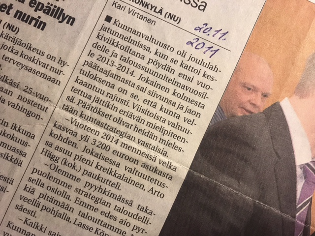 Ensimmäisen kauden kunnanvaltuutettuna kritisoin tuolloin voimakkaasti budjettikokouksessa hyväksyttyjä mittavia investointeja. Kaikki, mitä ehdotettiin meni läpi: Rajamäen uimahallin isompi laajennus, jäähallin laajennus, Kirkonkylän urheilupuisto…kaiken huippuna Klaukkalan uimahallille myönnettiin samassa isojaossa 300.000 euroa suunnittelurahaa. Kaikki tämä komeus tarkoitti 40 miljoonan euron velan ottamista. Tätä kritisoin vähäisestä valtuustokokemuksestani huolimatta ja pidin puheen pienistä kreikkalaisista sisällämme. Puheen, joka aiheutti ilmeisesti joissakin lainanottoon orientoituneissa valtuutetuissa inhon väristyksiä – ainakin se poiki myöhemmin kitkerää palautetta.